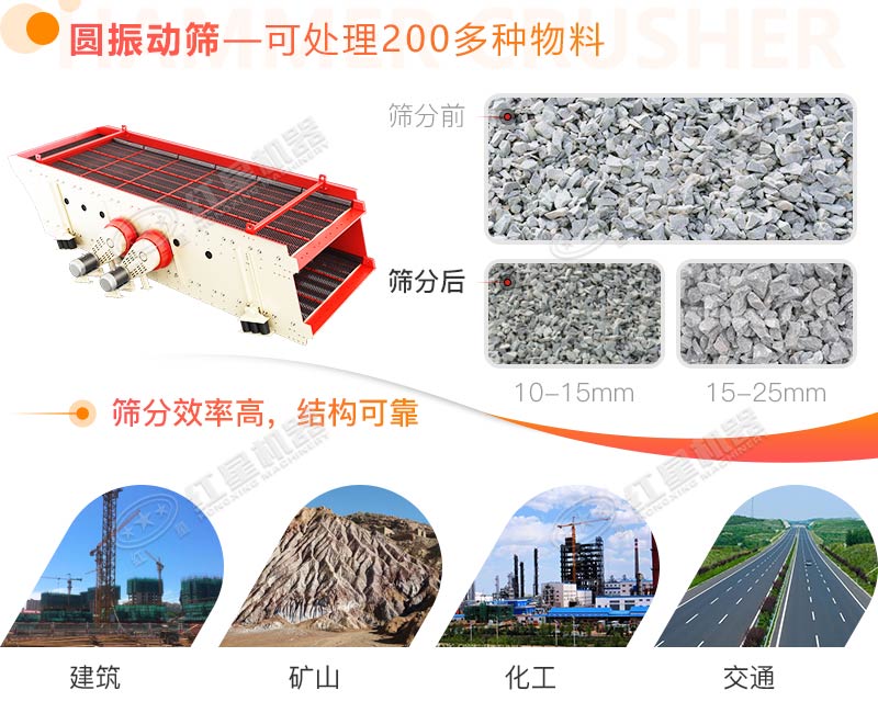 圓振動篩圓振動篩是一種做圓形振動、多層數(shù)、新型振動篩。圓振動篩采用筒體式偏心軸激振器及偏塊調(diào)節(jié)振幅,物料篩淌線長,篩分規(guī)格多,具有結(jié)構(gòu)可靠、激振力強、篩分效率高、振動噪音小、堅固耐用、維修方便、使用安全等特點,該振動篩廣泛應用于礦山、建材、交通、能源、化工等行業(yè)的產(chǎn)品分級。