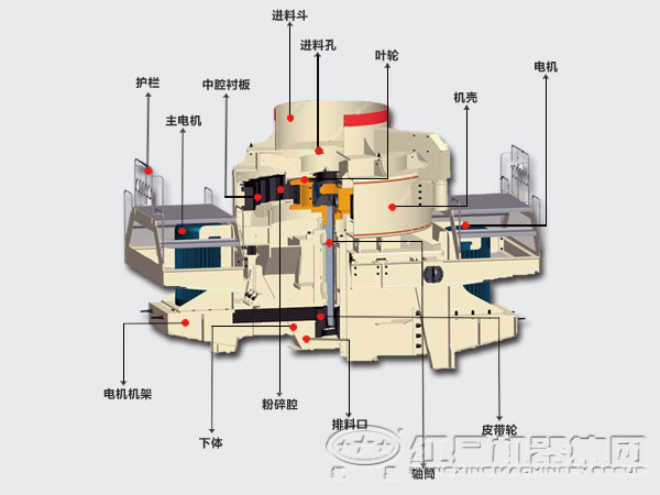 制砂機(jī)一般結(jié)構(gòu):制砂機(jī)主要由進(jìn)料口、溢料裝置、轉(zhuǎn)子、破碎腔、驅(qū)動裝置及機(jī)座這幾大部分組成。其工作原理是:物料由進(jìn)料口進(jìn)入破碎機(jī),在破碎機(jī)頂部由溢料裝置將物料分為兩部分,一部分經(jīng)溢料口進(jìn)入破碎腔,另一部分直接進(jìn)入轉(zhuǎn)子,物料以50-80m/s的速度從轉(zhuǎn)子內(nèi)三個均布的流道口發(fā)射出去,與溢料流發(fā)生碰撞,然后一起沖向破碎腔內(nèi)的物料墊,被物料墊反彈,斜向上沖擊到破碎腔的頂部,又改變其運(yùn)動方向,偏向下運(yùn)動,與溢流石料重新組合,這樣每塊物料在破碎腔內(nèi)受到兩次甚至多次破碎作用,而后從破碎腔落下由排料口排出。在整個破碎過程中實(shí)現(xiàn)的是物料與物料的碰撞,有效地減少了磨損。